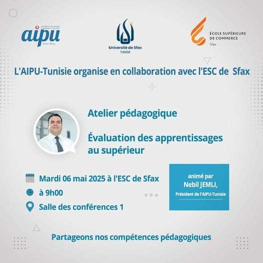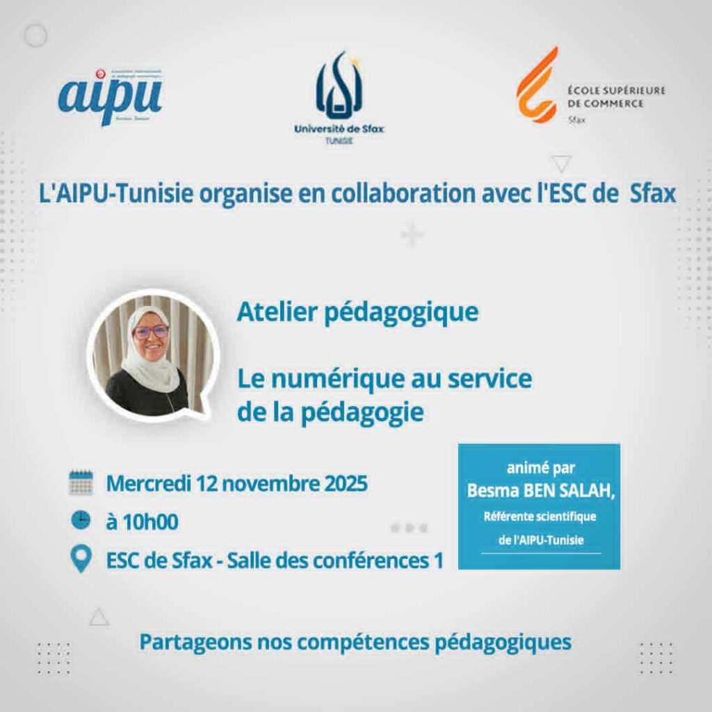 Vous souhaitez dynamiser vos pratiques pédagogiques, explorer des approches innovantes et améliorer l’engagement et la réussite de vos étudiants ? Participez à l’atelier dédié à l’innovation pédagogique dans l’enseignement supérieur, organisé par l’AIPU-Tunisie en mode classe virtuelle, les 29 et 30/11/2025, de 14h à 17h.